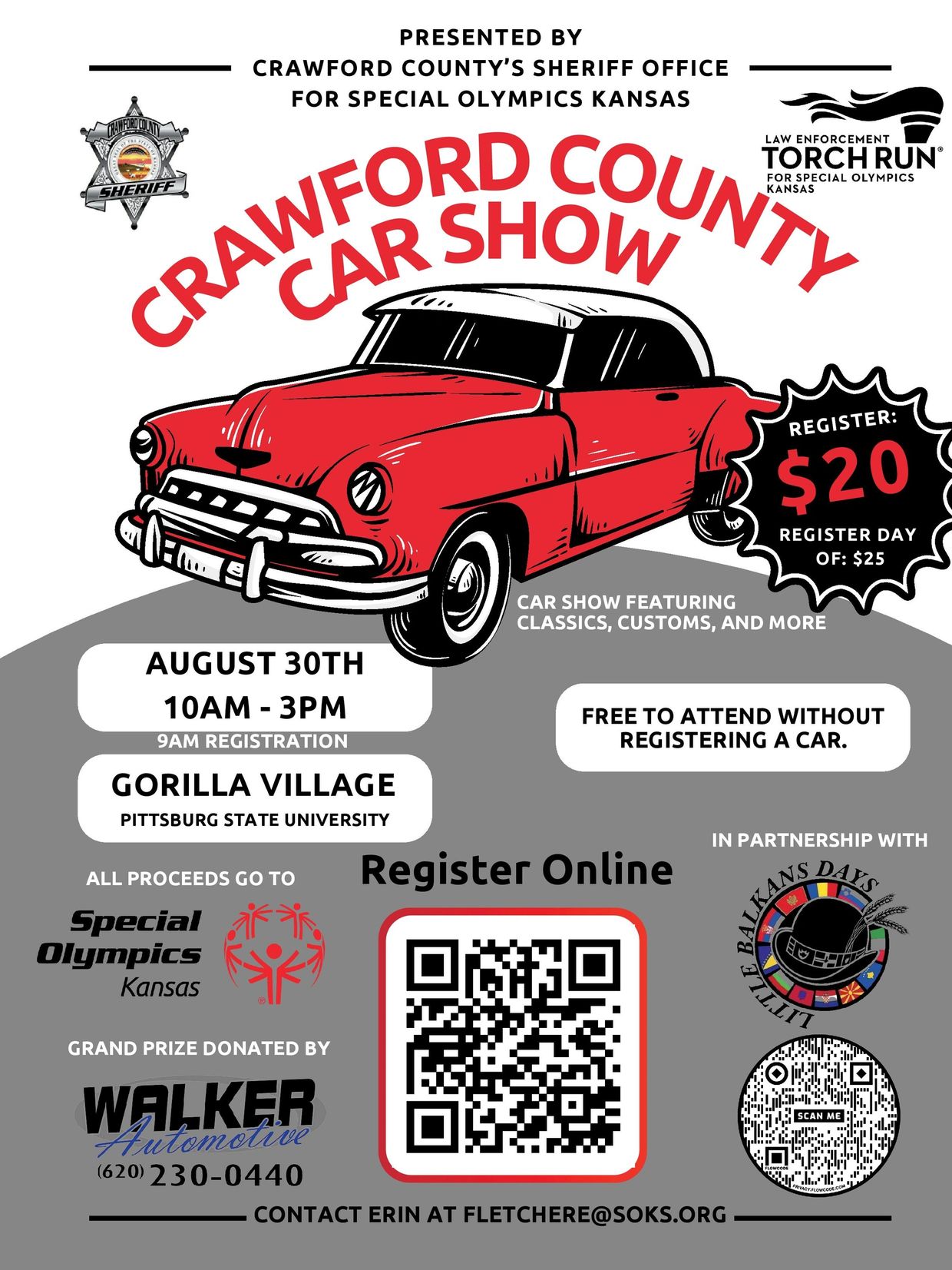 Come join us for an amazing afternoon at the Crawford County Car Show for Special Olympics Kansas! This car show will feature classics, customs, and more with trophies in 3 categories, including Athlete Choice. Plus, Fire trucks, police cruisers, and first responders will be on display.